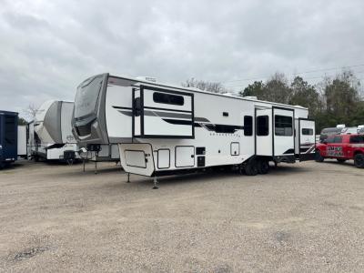 Sleeps 8 Slides 4 Length 42 ft 10 in Ext Width 8 ft 5 in Ext Height 13 ft 2 in Hitch Weight 2321 lbs GVWR 14500 lbs Dry Weight 12846 lbs Cargo Capacity 1654 lbs Fresh Water Capacity 60 gals Grey Water Capacity 90 gals Black Water Capacity 90 gals Furnace BTU 40000 btu Available Beds King, Queen Refrigerator Type 12V Refrigerator Size 16 cu ft Cooktop Burners 4 Number of Awnings 1 Water Heater Type On Demand AC BTU 27000 btu TV Info LR 50" 4K Smart LED TV Awning Info 16' Electric with LED Lights & Pitch Adjustment Axle Count 2 Washer/Dryer Available Yes Shower Type Shower w/Seat Electrical Service 50 amp Solar Wattage 200 watts Similar Fifth Wheel Floorplans