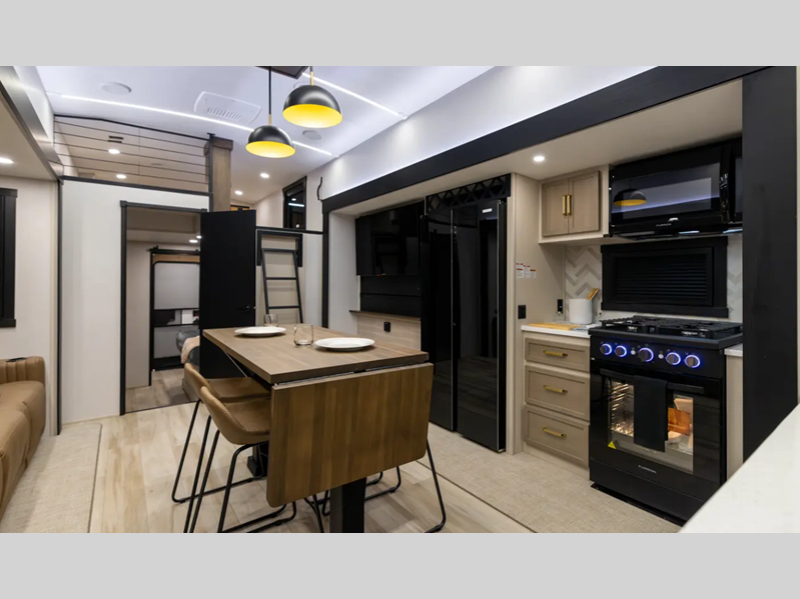 Sleeps 6 Slides 2 Length 37 ft 11 in Ext Width 8 ft Ext Height 12 ft 8 in Hitch Weight 2040 lbs Dry Weight 10269 lbs Cargo Capacity 3771 lbs Fresh Water Capacity 57 gals Grey Water Capacity 64 gals Black Water Capacity 30 gals Number Of Bunks 2 Available Beds Custom King Refrigerator Type 12V Refrigerator Size 16 cu ft Cooktop Burners 3 Number of Awnings 1 Water Heater Type On Demand Tankless AC BTU 15000 btu TV Info LR 50" LED Smart TV Awning Info 16' with LED Lights Axle Count 2 Washer/Dryer Available Yes Shower Type Walk-In Shower Electrical Service 50 amp Similar Floorplans